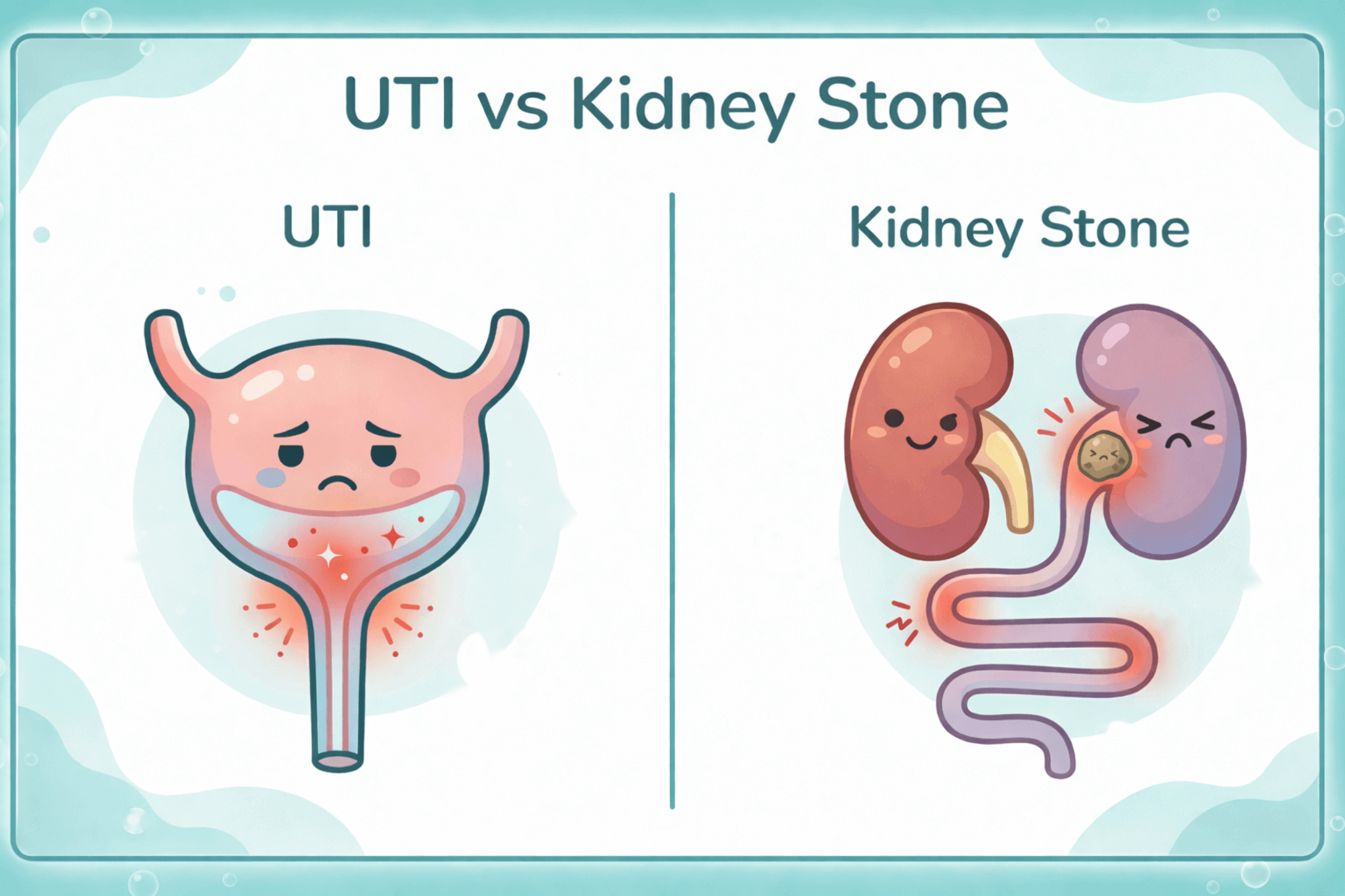 Illustration labeled “UTI vs Kidney Stone” comparing a sad, inflamed bladder for UTI on the left with kidneys and a ureter showing a painful stone blockage on the right.